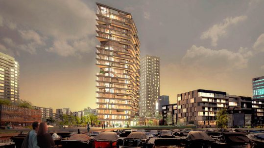Aan de Amsterdamse Amstel verrijst Haut, een van de hoogste houten gebouwen ter werel...